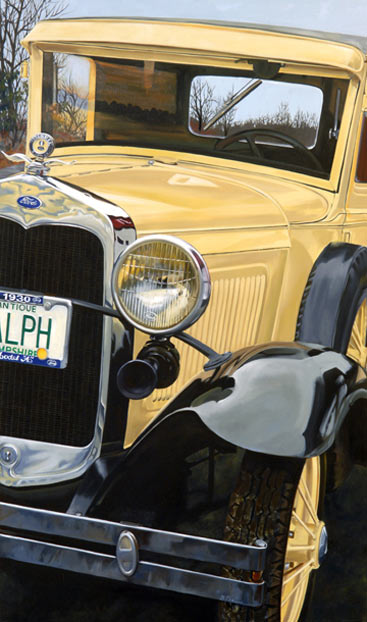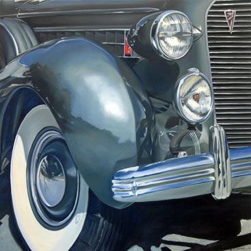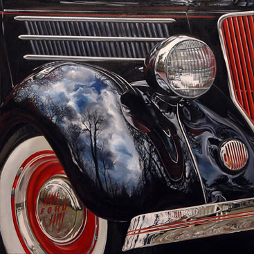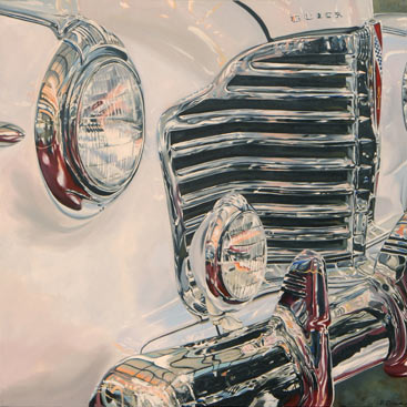I want the viewer to be pulled into my subject before he or she begins to think about how I got there. My automobile paintings probe into the relationships between “man and machine” combining realism and abstraction in a way that melds the familiar with the unexpected. Distorted objects reflected in the shiny surfaces create obscure images within the familiar curves of fender, chrome and headlight. When photographing the cars for painting, I often find myself reflected in the body of the car, becoming part of the object. Or is the car reflected in me, through my art? Our vehicles have become an extension of who we are and what we represent; asking the question, where does humanity end and machine begin?