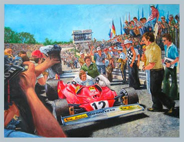 Showing their happiness, Reutemann comes to the pits after won at 1977 Interlagos, with Ferrari 312T2. F1 fans share their joy in the streets of boxes.